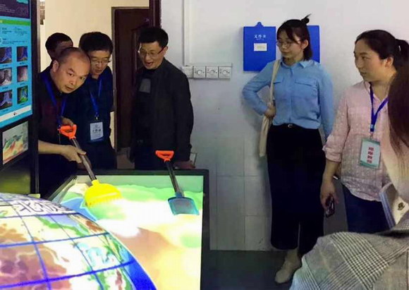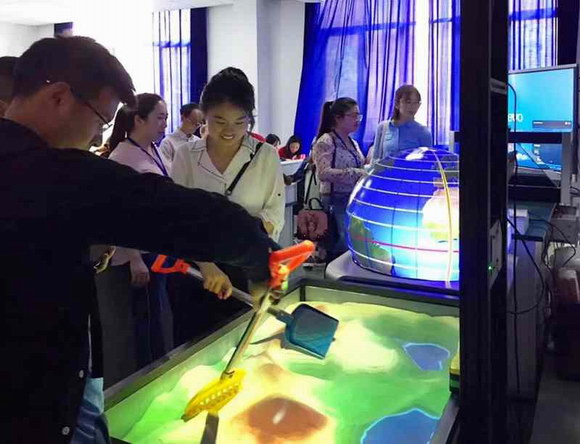 AR地理沙盤是一款寓教于樂的教學設備,可以實現投影的成像隨著沙堆高度的改變而呈現不同的地形地貌,還可模擬降雨、火山爆發等地理活動。學生們在“堆沙子”的過程中,輕松學習等高線、分水嶺、集水區等知識點內容。