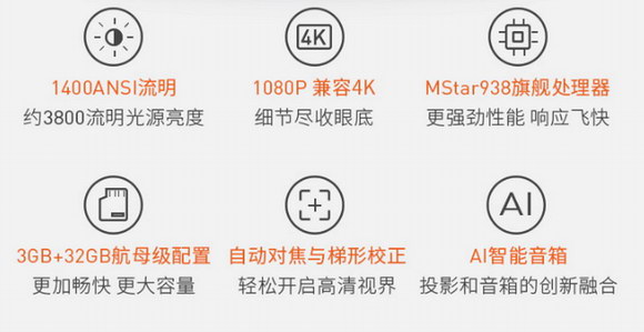 當貝投影儀f1光學上搭載0.47DMD顯示芯片,采用4組高亮度歐司朗LED光源,亮度能達到業內最高標準1400ANSI流明,光源壽命在30000h以上,DLP成像技術,藍寶石保護玻璃鏡頭組合11片進口肖特玻璃鏡片,匹配硬件上搭載CPU為MSD6A938 ,4核64位,GPU為MaLiT820,,基于安卓6.0系統開發當貝OS,采用3G+32G超大內存組合,802.11ac技術支持2.4G/5G雙頻WiFi,支持 4K HDR10畫質解碼,支持5.1音效處理,聲音輸出上可以實現虛擬環繞音效,支持遠場語音喚醒,語音搜索,藍牙遙控器,1.2:1投射比,最大可投300英寸巨幕。
