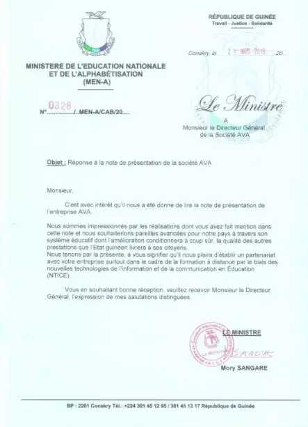 幾內亞政府教育與掃盲部部長莫里桑加雷向奧威亞發出了官方邀請,正式確定奧威亞為幾內亞國家遠程教育平臺建設唯一合作伙伴,并邀請上市公司、奧威亞商務、技術人員赴幾內亞調研市場、探討需求、洽談意向性訂單,為進一步全面搭建幾內亞教育信息化系統開展相關工作。