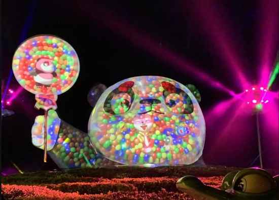 項目內容由韓國著名團隊精心設計,由兩臺4萬流明4K激光工程投影機通過疊加的方式投射。充足的亮度讓雕像成為最奪目的明星,精細的畫面與雕塑完美匹配,讓靜態的熊貓“活”了起來,賦予其豐富多樣的表情,為海內外游客呈現一場精彩的動畫表演。