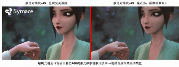 Symace®超旋光電獨(dú)創(chuàng)的自主專利,采用三基色直連式解決方案,實(shí)現(xiàn)無需抖屏的靜態(tài)消散斑,是行業(yè)里獨(dú)一無二的創(chuàng)舉。通過在光路中加入組合光學(xué)器件的方式,使光線的相位產(chǎn)生差異,從而降低激光的相關(guān)性,從此告別光斑干擾,告別銀幕振動裝置,告別高昂的價(jià)格和復(fù)雜的操作。