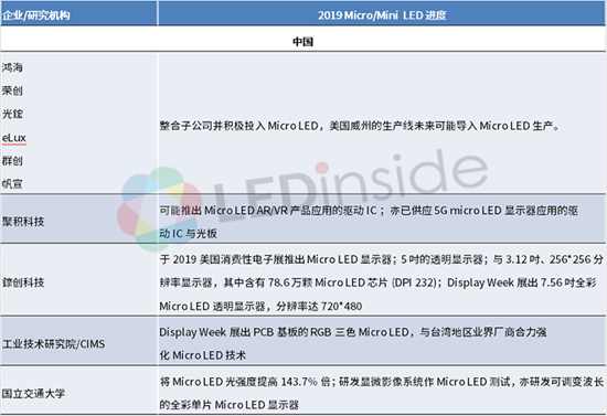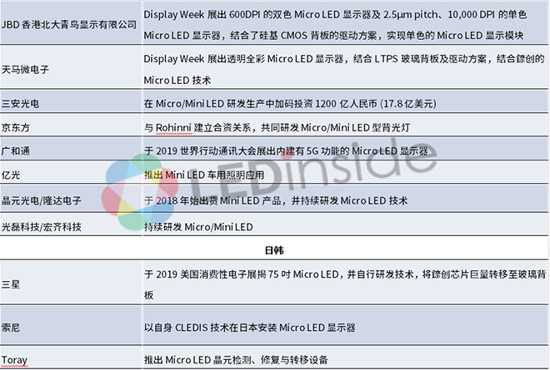 根據(jù)韓國智慧財產(chǎn)權(quán)廳分析,美國自從 2000 到 2018 年四月這段期間,所申請的Micro LED專利數(shù)達到 525件,占據(jù)全球總申請數(shù)的31%,中國與韓國則分別以353與243項專利尾隨在后,這三個國家合計占全球?qū)@暾垟?shù)量達60%以上。LEDinside也統(tǒng)整了2019年起始,全球廠商Micro LED技術(shù)發(fā)展最新動態(tài)如下表。