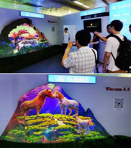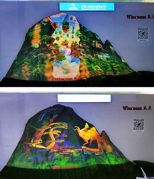 展會(huì)上采用2臺(tái)科視4K10-HS投影機(jī),搭配7thSense無(wú)損無(wú)壓縮媒體服務(wù)器在凹凸不平的假山上進(jìn)行投影。科視4K10-HS投影機(jī)具有科視Christie BoldColor 技術(shù),亮度高達(dá)10000流明,使投影畫面色彩更加真實(shí)自然,清晰明亮。7thSense無(wú)損無(wú)壓縮媒體服務(wù)器保證了畫面的無(wú)損無(wú)壓縮播放,讓影片的3D效果更加震撼。經(jīng)過(guò)變形融合技術(shù),畫面與山體結(jié)構(gòu)精準(zhǔn)契合,演繹一場(chǎng)生動(dòng)壯觀的山體投影秀,吸引參觀者紛紛駐足欣賞。
