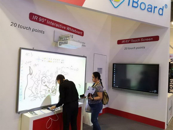 iBoard最新款 90”交互式電子白板同時支持20點觸控,搭配純激光光源的超短焦激光投影機,色彩逼真艷麗、明亮清晰,節能環保無毒無害,使用壽命高達20000小時,不存在更換燈泡光源的問題,高效防塵,更加穩定耐用,更易于安裝、管理。各種硬件搭配DrawView白板教學軟件、大小屏互動軟件等組合而成的智慧教育教學環境更是吸引現場觀眾紛紛前來體驗,不少客戶都表示艾博德的產品操作簡便,界面友好,相比同類教育產品更貼近實際需求!