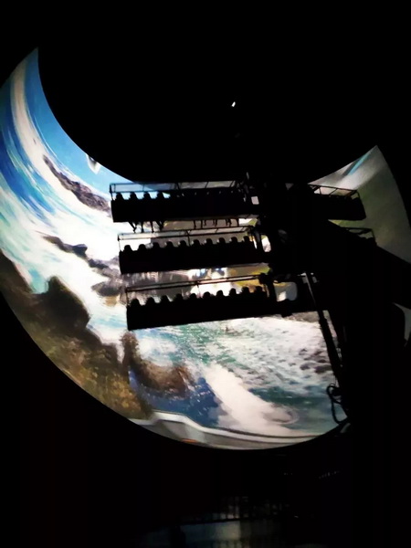 絲路探險區的“鄭和寶船”外觀仿造中國明代著名航海家鄭和下西洋時期的巨船,在船頭與船尾的仿真船艙內分別設有2套碗幕沉浸影院,通過全方位模擬電閃雷鳴、狂風驟雨下逼真的特效影像。該方案在寬達23米的幕上由1臺NEC 40000LM激光工程投影機+定制魚眼鏡頭投射影像,取代了之前多機位融合的方案,不僅僅能保證畫面的一致性,并且省去了大量的后續維護成本,是目前大型球幕、碗幕非常理想的解決方案。