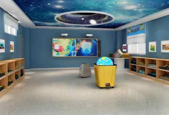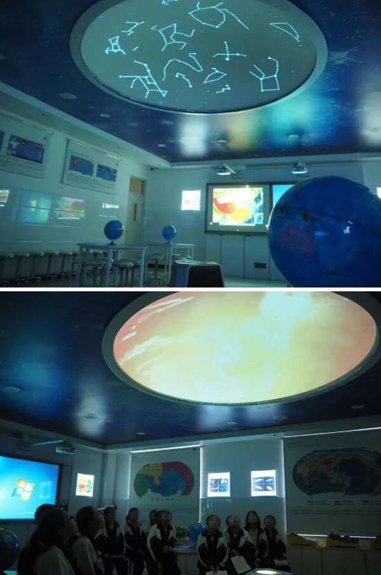 天文演示儀在天花板上投影出一個圓形的演示穹頂。將學生的視角由地球范疇,轉向太空乃至整個宇宙,將地理知識與天文教學有效整合,使學生了解地月系、地球與太陽系、地球與銀河系之間的關系,了解恒星、行星的形成及宇宙的演變過程。