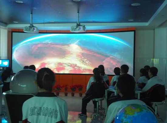 羿飛環幕示教系統位于教室后方,專用于地理視頻資源的播放。巨大的屏幕帶來震撼的視覺沖擊,直觀地展示事物發展的動態過程,讓課程內容變得更生動有趣。視頻課件對課程的導入、過渡作用,使課程進行得更自然順暢。