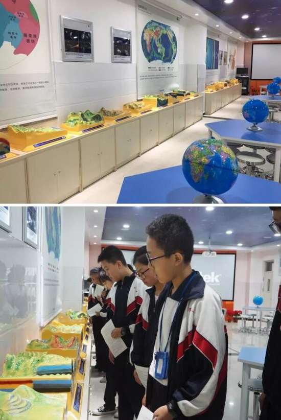 課后對知識的及時鞏固也至關重要,對于學生來說,背得再多,也不如親自動手模擬實驗來得印象深刻。教室四周陳列著十八種地形地貌模型,如板塊構造及地表形態模型、褶皺構造及地貌演變模型、島嶼成因演示模型、丹霞地貌、地下水模型等,制作精良,幫助學生加深對知識點的理解。
