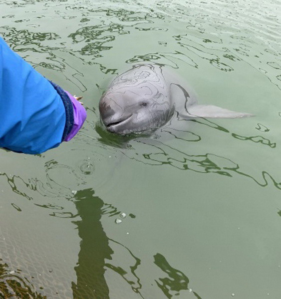 保護區的專職飼養員給江豚喂食
