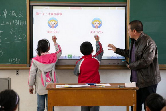 (公地鄉(xiāng)小學(xué),老師指導(dǎo)孩子在一體機(jī)互動(dòng))