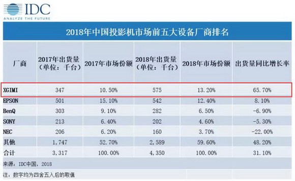 全球權威市場調研機構IDC發布的中國投影機市場跟蹤報告顯示,2018年,中國極米以57.5萬臺的出貨量、65.7%的增速穩居行業第一,打破了洋品牌稱霸中國投影機市場長達15年的局面;而2019年第一季度,極米不但繼續保持了領先的地位,更進一步擴大了與第二名的差距。