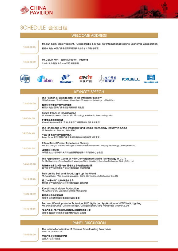 交流會參會嘉賓包括國家廣播電視總局科技委副主任杜百川先生、亞洲-太平洋廣播電視聯盟(ABU)技術部主任Ahmed Nadeem先生、國際廣電設備制造商協會(IABM)亞太區總監Peter Bruce先生,以及中科大洋、中視廣信、科旭威爾、北廣科技和廣東南光等民族企業代表。