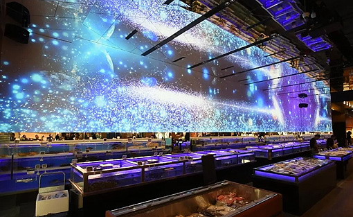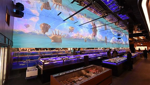 海鮮區有一面26米長、4米高的創意投影,這個堪比影院效果的巨幕寬屏是Hello Mart聯合安恒集團專門設計打造的,使用5臺12,000流明的松下激光機PT-SRZ12KC融合投射,PT-SRZ12KC擁有超精準的色域和極高的色彩感知度,震撼的高清影像就在你不經意的抬頭間盡收眼底。