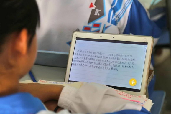 在課堂伊始,蔣老師向同學(xué)們展示了前一晚的預(yù)習(xí)情況的數(shù)據(jù)統(tǒng)計(jì),并把課堂內(nèi)容一鍵推送到學(xué)生平板。隨后,蔣老師請(qǐng)大家以一個(gè)單詞描述“音樂(lè)家朗朗”的外貌,同學(xué)們?cè)谀X中搜索詞匯,利用手中的平板將答案上傳。自動(dòng)生成觀點(diǎn)的詞云拼圖顯示在教室的大屏幕上,老師對(duì)大家的觀點(diǎn)予以匯總并逐個(gè)講解,難點(diǎn)擊破。