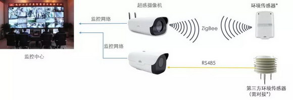 ▷ 環境傳感器通過ZigBee協議將數據傳送給超感攝像機,超感攝像機同時配合視頻圖像上傳至監控中心,實現實時環境監測