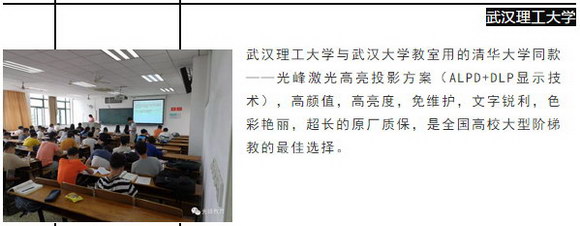 近年來,武漢多所高校選擇光峰品牌為其提供多媒體顯示設(shè)備,如武漢大學(xué)先后采購光峰激光投影方案300余套,其采用最多的是光峰激光高亮投影方案,對使用效果非常滿意。
