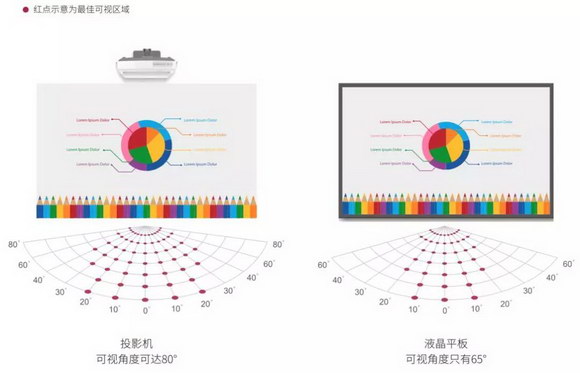 可視角度上,光峰投影比大屏一體機多15°,保障兩邊和側面的學生看見清晰的教學內容。大幅度提高老師的授課效率,節約時間,實現教學資源更加的公平。