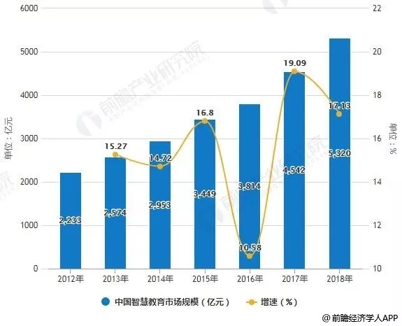 據前瞻產業研究院發布的《中國智慧教育行業發展前景預測與投資戰略規劃分析報告》統計數據顯示,2012年中國智慧教育市場規模已達2233億元,2013年以來,在線教育和教育信息化均處于快速發展時期,從而推動我國智慧教育市場規模不斷擴大。到了2017年中國智慧教育市場規模增長至4542億元,同比增長19.09%。綜合在線教育以及教育信息化的市場規模綜合測算得出,2018年中國智慧教育市場規模約為5320億元,同比增長17.13%。
