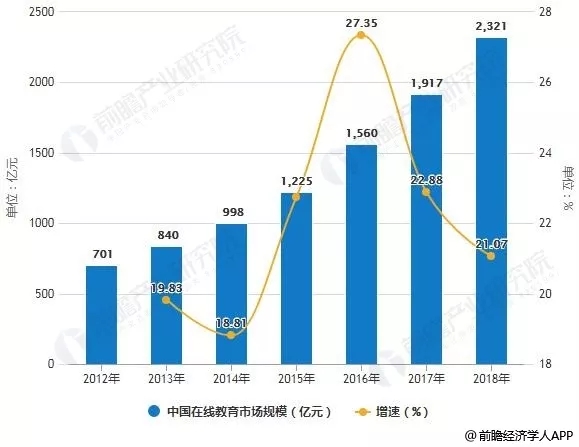 因此,在升學就業需求、技術創新、政策規范的共同促進下,我國在線教育市場發展迅猛,2012年市場規模僅為701億元,2017年市場規模已達1917億元,5年復合增長率達到22.3%。預計2018年我國在線教育市場規模將達到2321億元,同比增長21.07%。