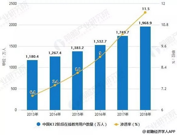 除了國內在線教育行業市場規模實現持續擴容外,我國在線教育的用戶滲透率也逐年提升。以K12階段為例,2013年,K12階段在線教育用戶數量僅為1180.4萬人,滲透率僅為6.8%;2018年,K12階段在線教育用戶數量達到1968.9萬人,滲透率已達11.5%。