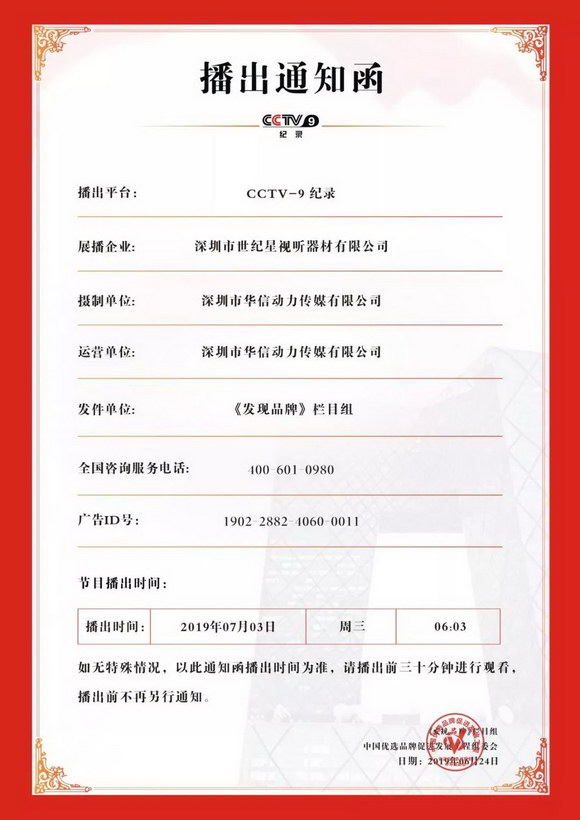 在結束了對“世紀星”的深入采訪之后,《發現品牌》欄目組將此次走訪制成專題片,并于2019年7月3日起在CCTV—9頻道上播出,將世紀星“專心、專注、專業”的承諾,為滿足人們需求而積極打造信息傳播窗口的精神傳遞給全國觀眾,敬請期待!