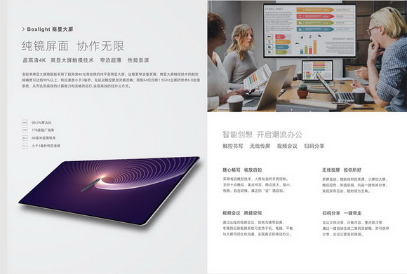 為滿足中小型會議需求,解決簡便、及時、互動溝通等需求,無錫光峰光電通過多年研發(fā)設(shè)計,打造出寶視來Boxlight商顯大屏--電容版,解決了政企、單位、學校、醫(yī)院等在智能交互式觸控辦公教學的問題,高清大屏、觸控操作、無線傳屏、視頻會議,打破傳統(tǒng)為用戶提供更加高效的智能輕辦公環(huán)境