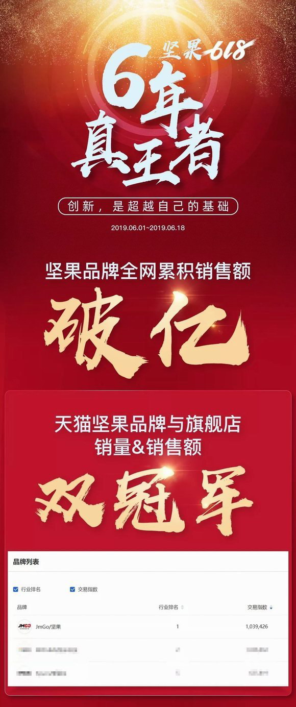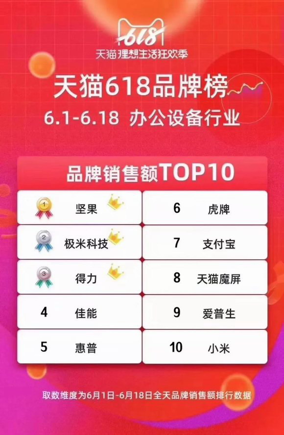 2019年618年中狂歡圓滿落下帷幕,堅果智能投影品牌全網累積銷售額破億,堅果天貓品牌與旗艦店銷量&銷售額雙冠軍,天貓618品牌榜6.1-6.18辦公設備行業全天品牌累積銷售額TOP 1,官方認證實至名歸。