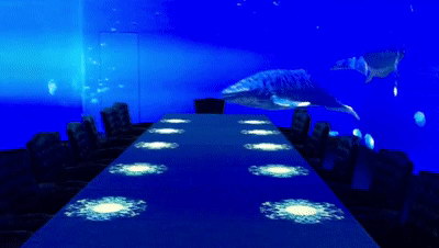 為了投射更加沉浸的畫面,餐廳特地將進出的門做成了暗門。當食客走進餐廳包廂,關上門后,四周的墻壁上海水涌現出來,海龜在浮動的海草間穿越,不時吹動起泡泡。