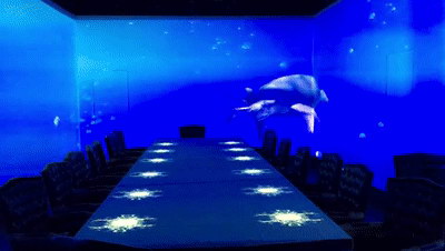 碩大的鯨魚從一個角落穿出來,在四周游動,正想和你共進晚餐。當你看到它朝你游來的時候,你剛想要伸手撫摸,它卻又在此時從墻壁上隱去。好的產品,自己會傳播,來這樣的餐廳用餐,首先就是拿起手機拍拍拍了呢!