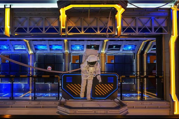 在這里,工作人員身穿航天服,檢票處被稱(chēng)為登艙口,影廳門(mén)仿照太空艙門(mén),全部模擬現(xiàn)實(shí)場(chǎng)景,為觀眾帶來(lái)一種真實(shí)的空間站體驗(yàn)。