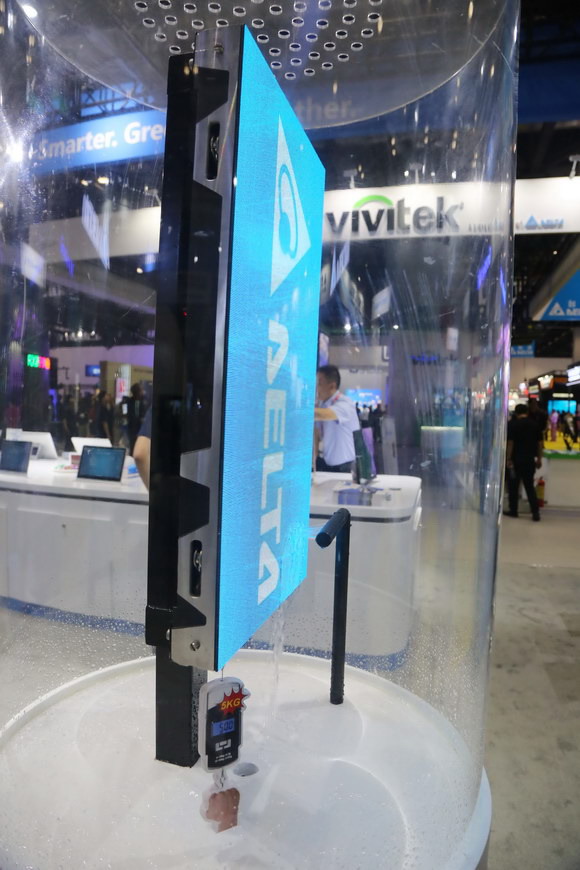 此處展出的臺達P1.2mm小間距LED,也特別呈現其防潮防水、堅固耐沖擊的特質。臺達小間距LED通過真空納米涂層技術,具有更加優秀的防潮、防水、防鹽霧性能表現,兼具能耗低、使用壽命長及出色的亮度、色彩等特點,是環境相對較惡劣的控制室、商業顯示等室內高端顯示的最佳選擇。