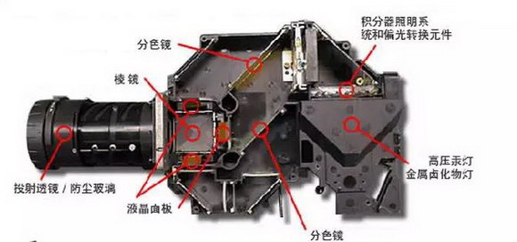 投影機主要的工作原理都是由光源發出光,通過一系列的光學照明系統,將光源的光均勻的照射到顯示芯片上,而信號通過電路系統在顯示芯片上實現色階以及灰階,顯示出圖像,此后由投影前端的投影鏡頭將顯示芯片上的圖像放大投射到相應的屏幕上。在投影系統里面,光學主要分為成像光學系以及照明光學系,而其中最為關鍵的元器件則為顯示芯片以及照明組件(即光源)。