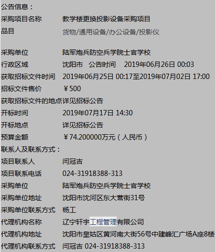 遼寧軒宇工程管理有限公司受陸軍炮兵防空兵學院士官學校委托,根據《中華人民共和國政府采購法》等有關規定,現對教學樓更換投影設備采購項目進行公開招標,歡迎合格的供應商前來投標。