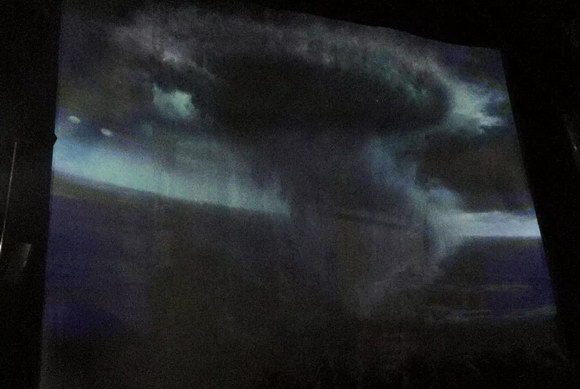 “龍卷風(fēng)暴”幕布高13米,寬12米。在該項(xiàng)目的高潮部分,游客將會(huì)被提升到9米高地方,配合投影效果,讓游客目光所及之所皆是暴風(fēng)與怒浪的壯觀景象,感受身處暴風(fēng)中心的獨(dú)特體驗(yàn)。贏康設(shè)計(jì)師在高達(dá)9米的投影平臺(tái)完成了投影機(jī)的安裝與調(diào)試。