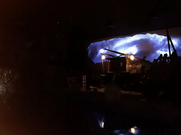“天地突變”主要營造暴風(fēng)雨前的緊張氛圍,通過濃密的烏云,不斷閃現(xiàn)的閃電,與幾處已經(jīng)成型的龍卷風(fēng)烘托出躁動(dòng)不安的海面,配合噴霧、燈光、座椅等設(shè)施,將觀眾代入逼真的海上風(fēng)暴的現(xiàn)場。