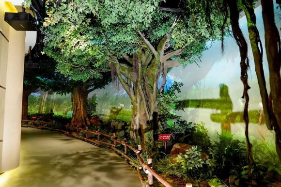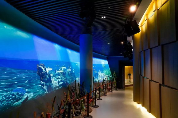 在進入二樓的過程中,有一條氣勢恢宏的閩侯生態斜坡長廊。該展項巧妙利用大型坡道空間,通過索諾克激光工程投影機結合半景畫場景,以三維動態影片繪就了一幅生態畫卷。在曲徑通幽的閩侯生態斜坡長廊,22臺索諾克SNP-LU6600激光工程投影機一字排開,以其色彩的高度一致性和4K高清畫質展現閩侯海洋環境和生態環境的變化。觀眾漫步于幽雅之境,仿若穿越回到萬年前的閩侯生態環境,切身體驗了一場與大自然的千古對話。