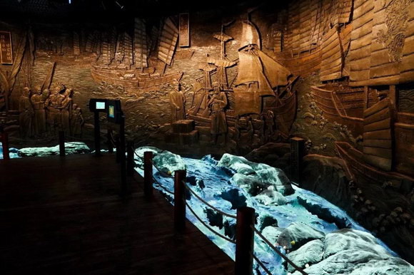海上絲綢之路以AR互動的形式查看每個浮雕的內容介紹(每副浮雕代表海絲之路發展的一個時期),投影在浮雕上的水波紋,營造出海上拍浪的氛圍。安靜的石雕遇到4臺索諾克SNP-LU6600激光工程投影機瞬間變成奔騰的大海,立于石雕旁仿佛置身浩瀚的大海。