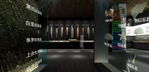 為了讓參觀者可以更直接的了解到當(dāng)?shù)叵笳餍缘刭|(zhì)地貌的剖面組成部分,將當(dāng)?shù)靥厣牡刭|(zhì)橫切面展示出來(lái),并融合移動(dòng)滑軌屏展示系統(tǒng)和納米全息透明屏展示系統(tǒng),讓參觀者在互動(dòng)娛樂(lè)的同時(shí)能對(duì)地質(zhì)標(biāo)本進(jìn)科普了解,寓教于樂(lè)。