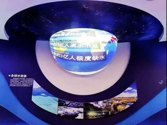 校正功能,進一步提高投影機安裝適應性,輕松實現異形投影。得益于此,在展示半球立體異形時,參觀者抬頭仰望著“世界上26個國家約3億人極度缺水”的滾動信息,瞬間倍感驚訝!