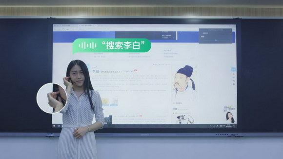 在過往的課堂里,當講到教學設計之外的知識點延伸時,老師往往需要回到講臺,打開網頁,搜索對應的知識點呈現給學生。這樣費時的操作常常打斷老師原有的課堂節奏。在課堂上,多數老師的理想狀態是心無旁騖地開展教學。小沃同學的語音搜索功能則為老師為此做出了巨大貢獻,“搜索靜夜思的朗讀音頻”、“搜索‘正無窮’”、“搜索李白的人物簡介”……老師一聲令下,小沃同學便能快速聽取搜索指令并執行,為全班師生答疑解惑。