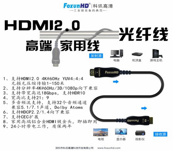 根據現場距離及項目穩定性的要求,FoxunHD科訊建議短距離非工程選擇HDMI光纖線最合適,能解決問題,又能降低成本。因HDMI光纖線傳輸性問題(HDMI光纖線是由多根銅線與四芯光纖組成,四芯光纖承擔音視頻傳輸,銅芯線承擔信號通訊傳輸與HDMI信號協議傳輸及HDMI線的供電需求,HDMI光纖線的耗電需求取自于HDMI兩條設備的HDMI端口的5V2A電源供電,無外接電源,由此局限HDMI光纖線的長度、可靠的穩定性與多維度的兼容性),所以HDMI線更適合近距離簡單環境,非24小時供電需求的工程項目。