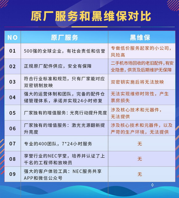 從圖中我們可以看出,NEC原廠服務有百年企業作為信譽擔保,更加安全、可靠。并且NEC始終堅持以用戶為中心的服務理念,構建了非常完善的售后服務體系,培養了極具專業性的工程師團隊,無論是配件品質、服務質量、服務體驗、服務范圍,原廠服務都遠超黑維保。尤其是NEC于行業內首推的兩大王牌增值服務,光亮行動和光源翻新服務,它們對操作環境要求之嚴苛、技術之專業,黑維保根本無法做到。