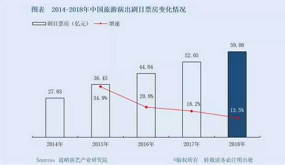 近五年,旅游演出市場持續走高,但增速明顯放緩。2018年旅游演出票房收入為59.08億元,較2017年增加7.03億元,增長比率為13.5%。其中,宋城千古情系列、長隆系列演出票房增加2.7億,為票房增長貢獻了38.4%。