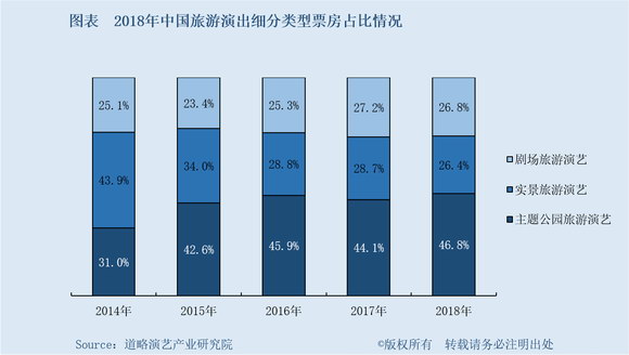 2018年主題公園旅游演藝仍保持較快發展速度,票房增長20.5%,票房占比達46.8%。實景旅游演藝僅增長5.7%,市場份額連續四年下滑。