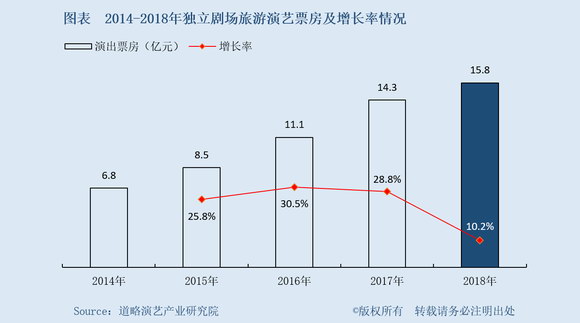 獨立劇場旅游演出票房增長10%,增速放緩。2018年,獨立劇場旅游演藝票房達15.8億元,同比2017年僅增長1.5億元,增長率僅為10.2%,增速明顯放緩,低于旅游演藝整體增長。