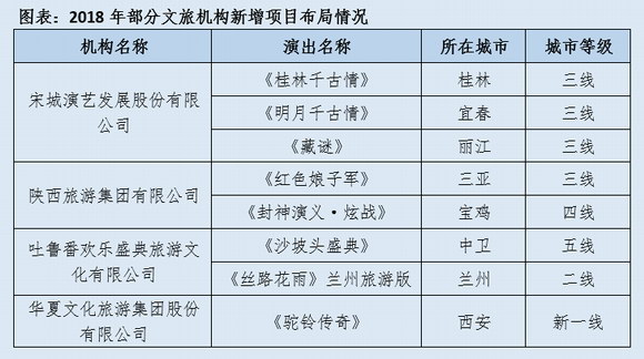2018年旅游演藝新增的47臺演出多位于二三線以下城市,共34臺,占比高達72.3%,其中宋城演藝、陜旅集團等大型文旅機構新開發項目多位于三線及以下城市。