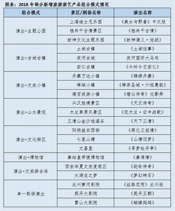隨著游客對場景體驗的需求越來越高,單一的旅游演藝產品難以滿足游客的消費需求,旅游演藝開始朝組合型產品業態發展。2018年新增的47臺旅游演出中,91.5%的演出均依托景區開展,且組合模式更加多元化。