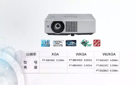 松下激光光源投影機PT-BMZ\BMW系列光源壽命長達20000小時,亮度覆蓋4500lm-6000lm,動態對比度3,000,000 : 1,覆蓋XGA \ WXGA \ WUXGA分辨率,是一款兼顧高亮度、高倍變焦、鏡頭位移、無線投影、便捷維護、健康護眼、高效防塵與緊湊機身為一體的新產品。