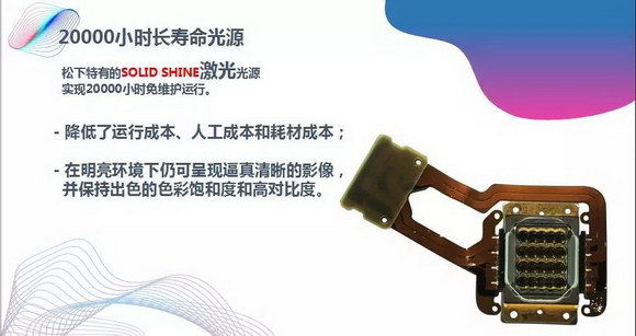 松下通過對燈泡光源進行技術革新,將燈泡更換周期延長至20000小時。通過降低亮度衰減和增強冷卻功能,在呈現卓越畫質的同時,實現更低的維護成本。并且松下特有的SOILD SHINE激光光源與HLD新光源,均能實現20000小時免維護運行。
