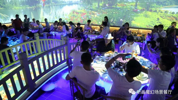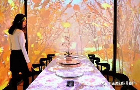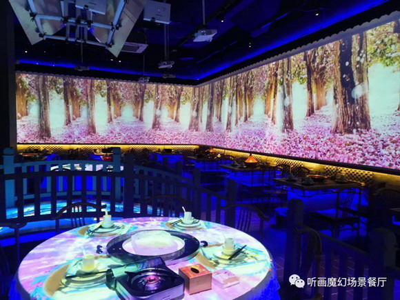 眾所周知,在就餐過程中,餐廳環境還會影響到用餐體驗,從而影響顧客對餐廳的整體評價。從這個意義上講,餐廳環境會影響到餐廳的經濟效益。所以很多餐飲人直接將餐廳打造成能吸引消費者目光的樣子,但是市場上靠裝修風格取勝的餐飲廳太多太多,不能盡可能滿足所有人的審美與要求。而聽畫這家餐廳靠著7D全息技術實現了無裝修也能隨意轉換風格,對于餐飲人來說,無疑是“雪中送炭”。